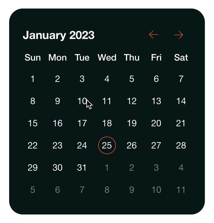 A month calendar picker in use cycling between January 2023 and October 2022.